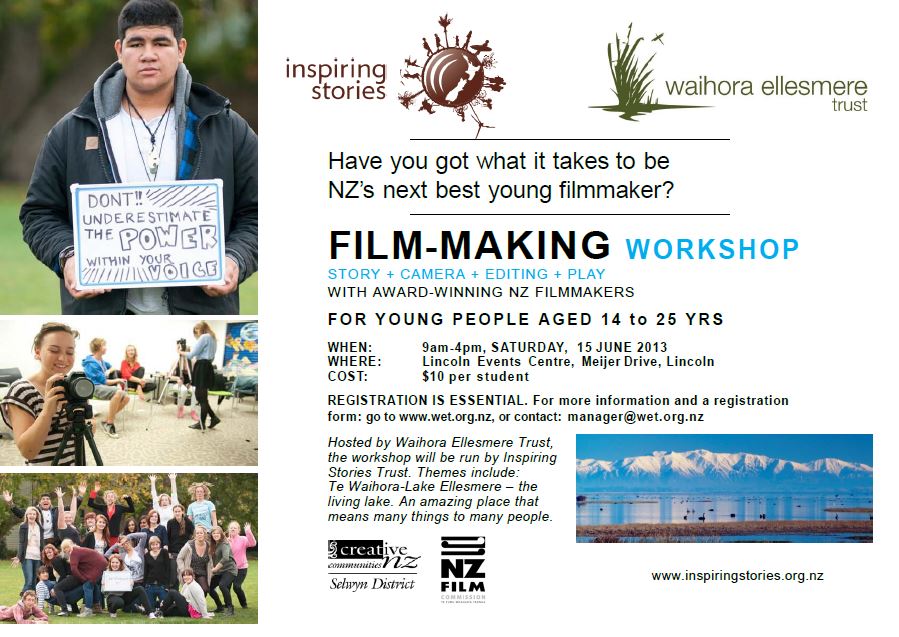 The workshop is an initiative of Inspiring Stories Trust – a charitable trust based in Wellington. Each year the Trust takes some of New Zealand’s best award-winning young filmmakers on the road to share skills with the next generation. Each workshop helps young people develop skills and confidence in story, camera, editing and creative process. Workshops support participants to explore 21st century issues affecting their future (social, environmental, economic etc), brainstorm solutions and connect with local people making a difference. In 2012, more than 300 young people took part in workshops nationwide, several of whom went on to enter the Inspiring Stories Film Competition and win awards, internships and exposure for their work.